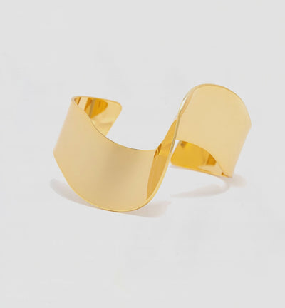 Sculpted in a wide, flowing wave, this cuff captures the feeling of movement smooth, fluid, and bold in its simplicity. Polished gold curves around the wrist with quiet strength and striking shape.
